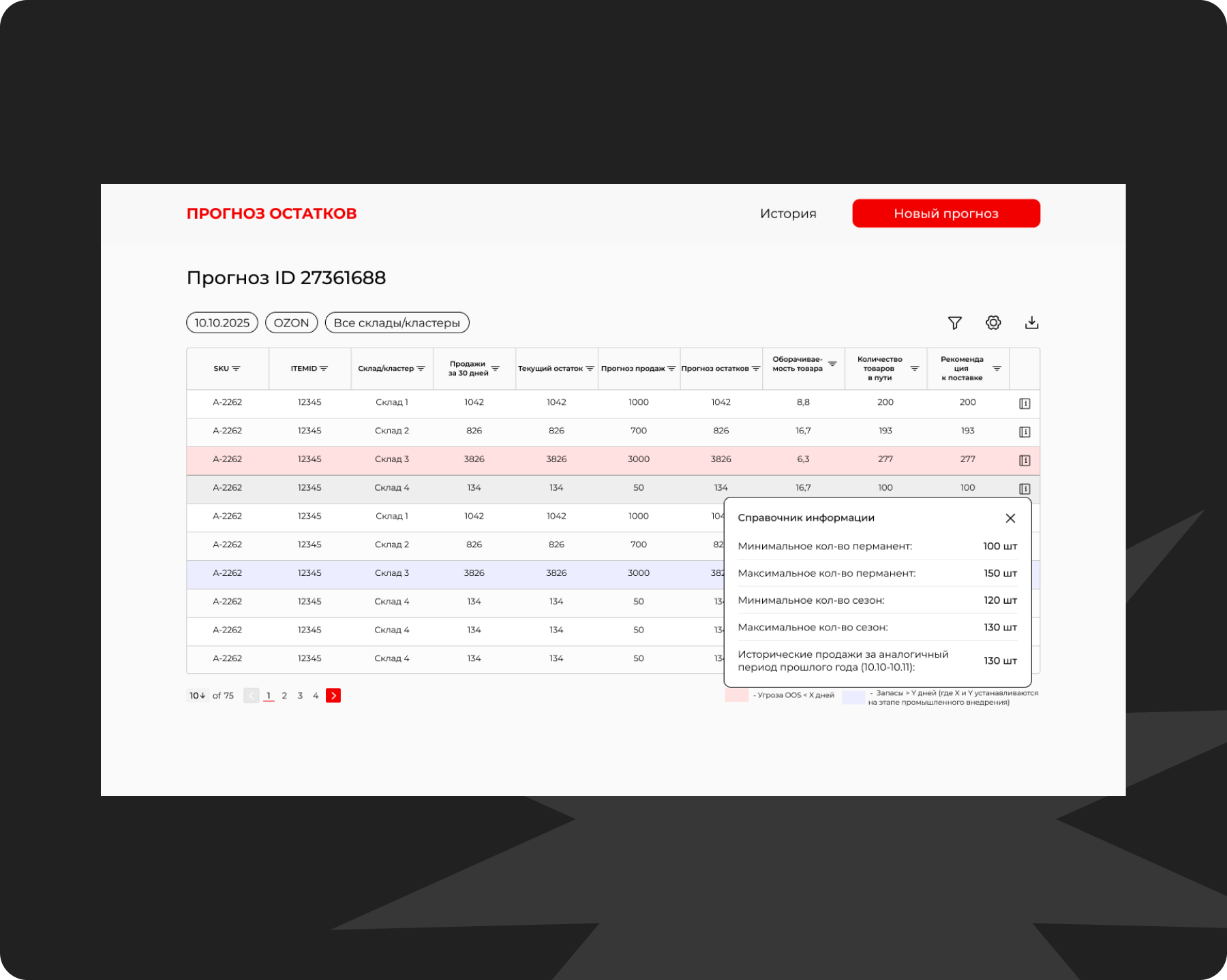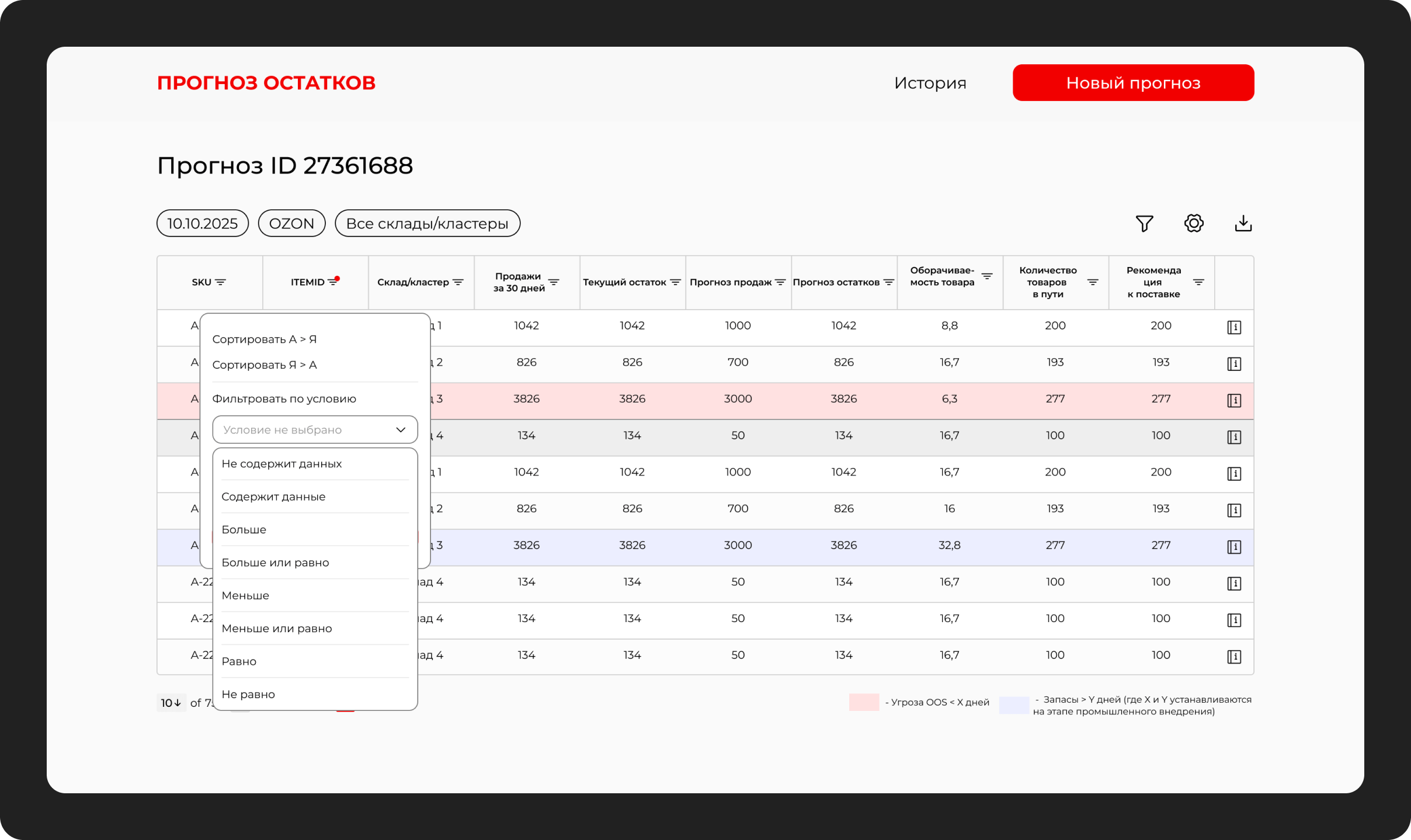 - Реализовать модуль визуализации результатов: выводить таблицу с полями SKU, ITEMID, прогноз поставок на маркетплейсы, прогноз продаж, оборачиваемость и рекомендованная поставка. Обновлять данные в таблице после пересчёта прогноза.