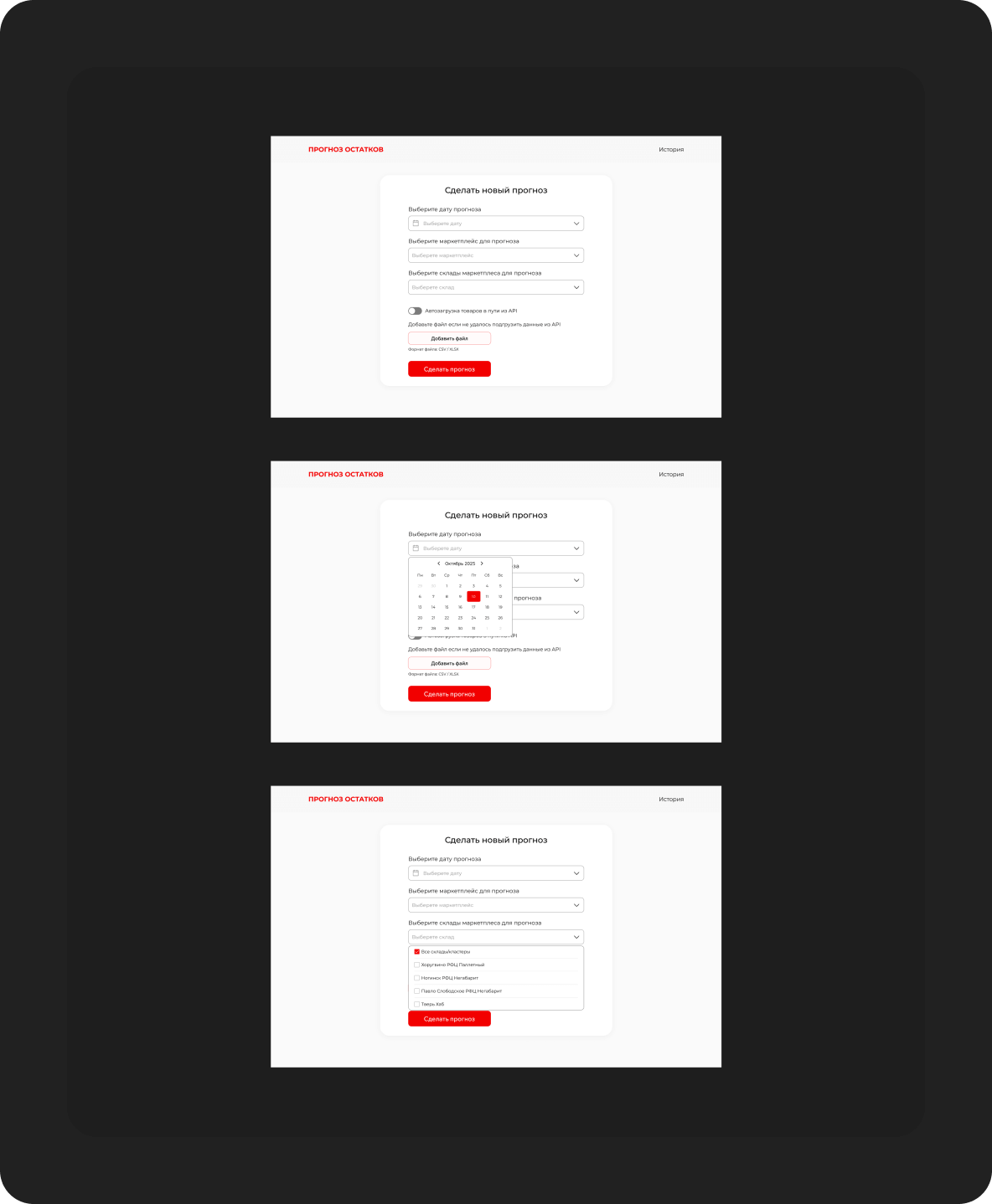 Пример: Клиент вводит ручные корректировки (период прогноза, маркетплейс, кластер/регион поставки и количество товаров в пути). После нажатия кнопки «СДЕЛАТЬ ПРОГНОЗ» система рассчитывает прогноз поставок.