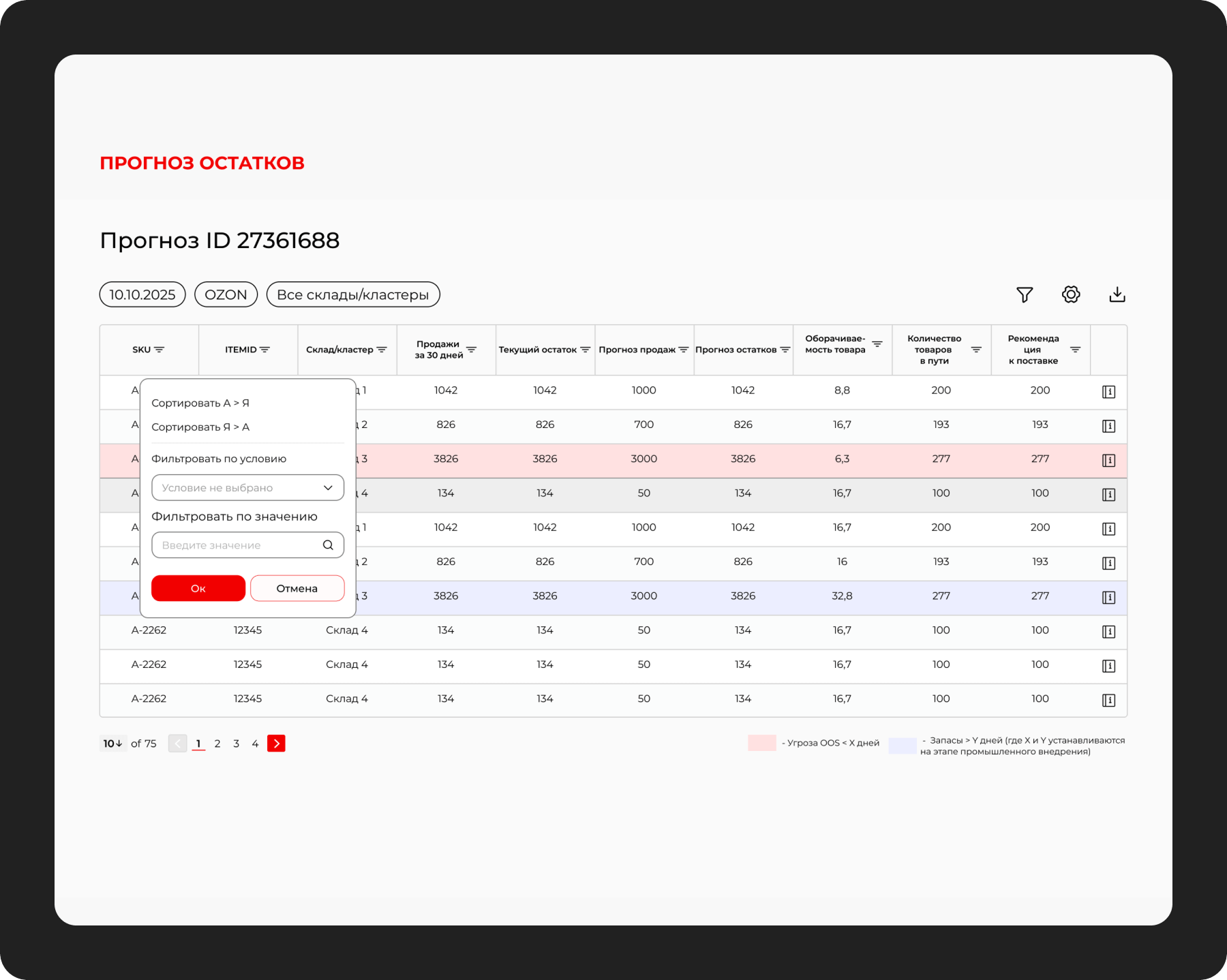 - Автоматизировать пороги срабатывания алертов. Подсветка и/или сигнализация угрозы OOS (Out Of Stock) и перетаривания склада.