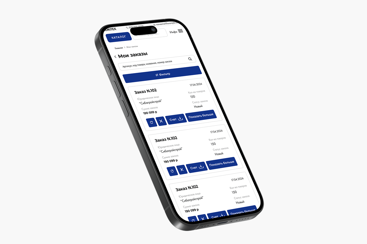 Для получения актуальной информации о товарах мы разработали микросервисы, ежедневно парсящие прайсы и характеристики с сайтов поставщиков. Эти данные автоматически преобразуются в формат, совместимый с 1С, и далее попадают в интернет-магазин. Реализована защита от дублей, что обеспечивает чистоту базы. Также был доработан модуль ценообразования — он учитывает не только тип клиента и объем заказа, но и происхождение товара: со склада Semitex или напрямую от поставщика. Все цены корректно пересчитываются в рубли и отображаются за единицу товара, даже если в 1С они хранятся в долларах за тысячу штук.