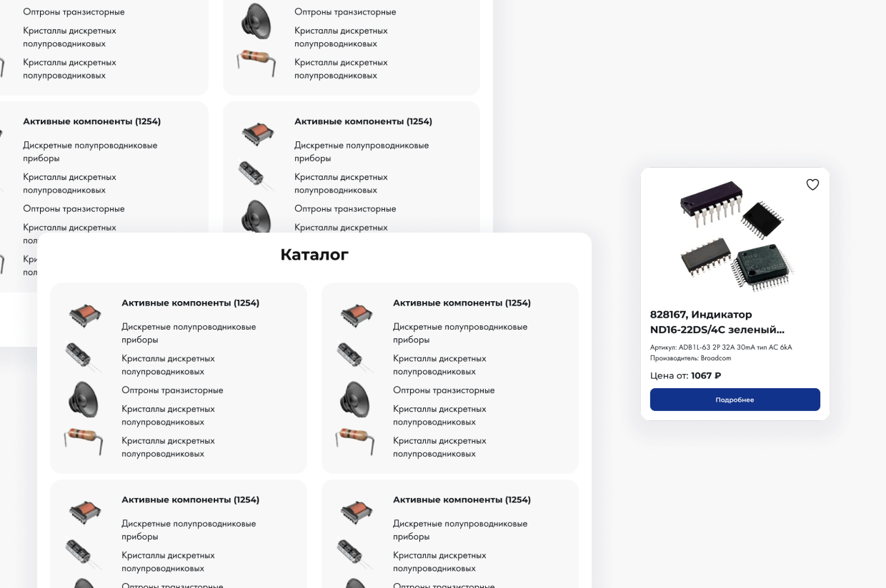 Каталог был спроектирован с учетом специфики отрасли: изображения у компонентов играют второстепенную роль, на первом месте — характеристики, наличие и цена. Мы реализовали табличную верстку каталога и карточек, где все важные параметры видны сразу — без перехода внутрь карточки. Такой подход позволяет быстро сравнивать и добавлять позиции в заказ.